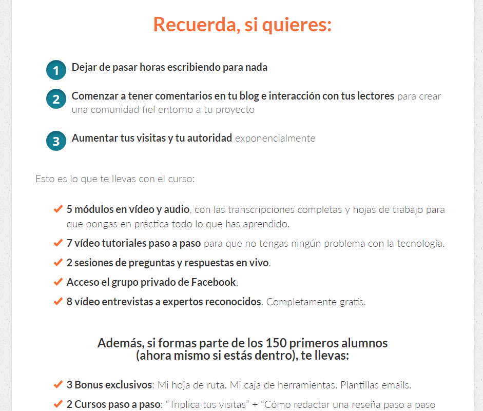 - Ponte bajo la piel del lector: métete bajo la piel de tu lector o cliente ideal y ponte su traje. Esto consiste en algo tan simple como empezar a decirle las cosas que siente desde el minuto 1 del texto. ¿Quieres un ejemplo? Mira la página de ventas del curso Facebook Ads para Social Media Managers de Maite López. Y de paso compra el curso, que a mí Maite me está haciendo un trabajazo brutal con Facebook Ads 😀