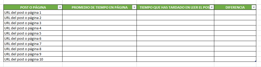 - Tiempo que has tardado en leer el post: pon el tiempo que has tardado y, si puedes, haz que otra persona haga esta tarea para tener datos más fiables.