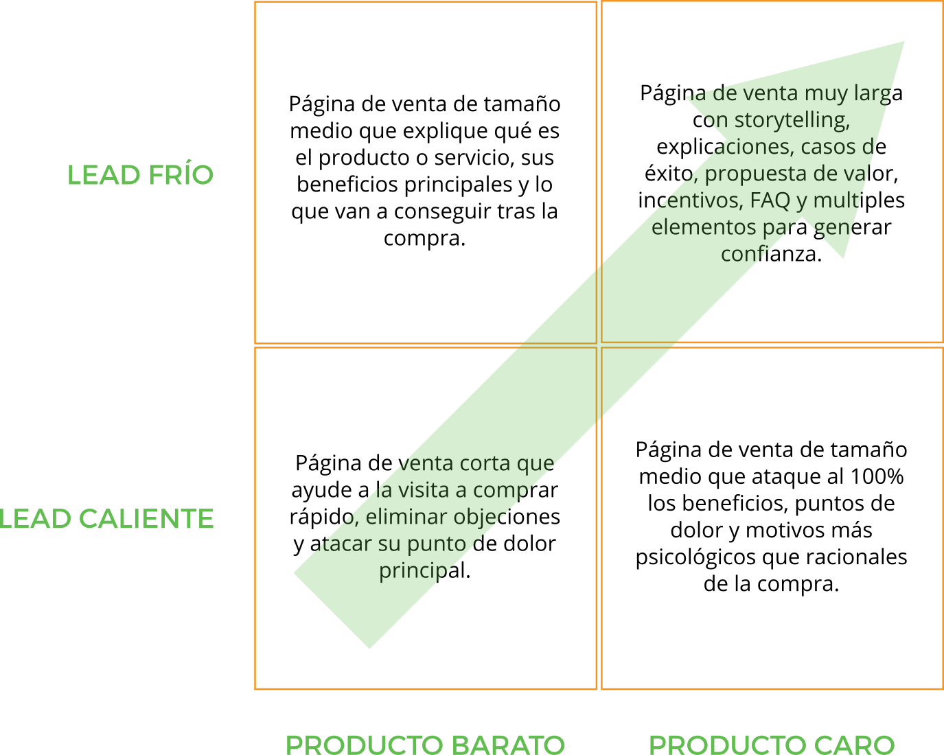 Vamos a resumir todo lo que he dicho en un pequeño cuadrante. Te recomiendo que lo revises cuando vayas a escribir tus páginas de ventas.